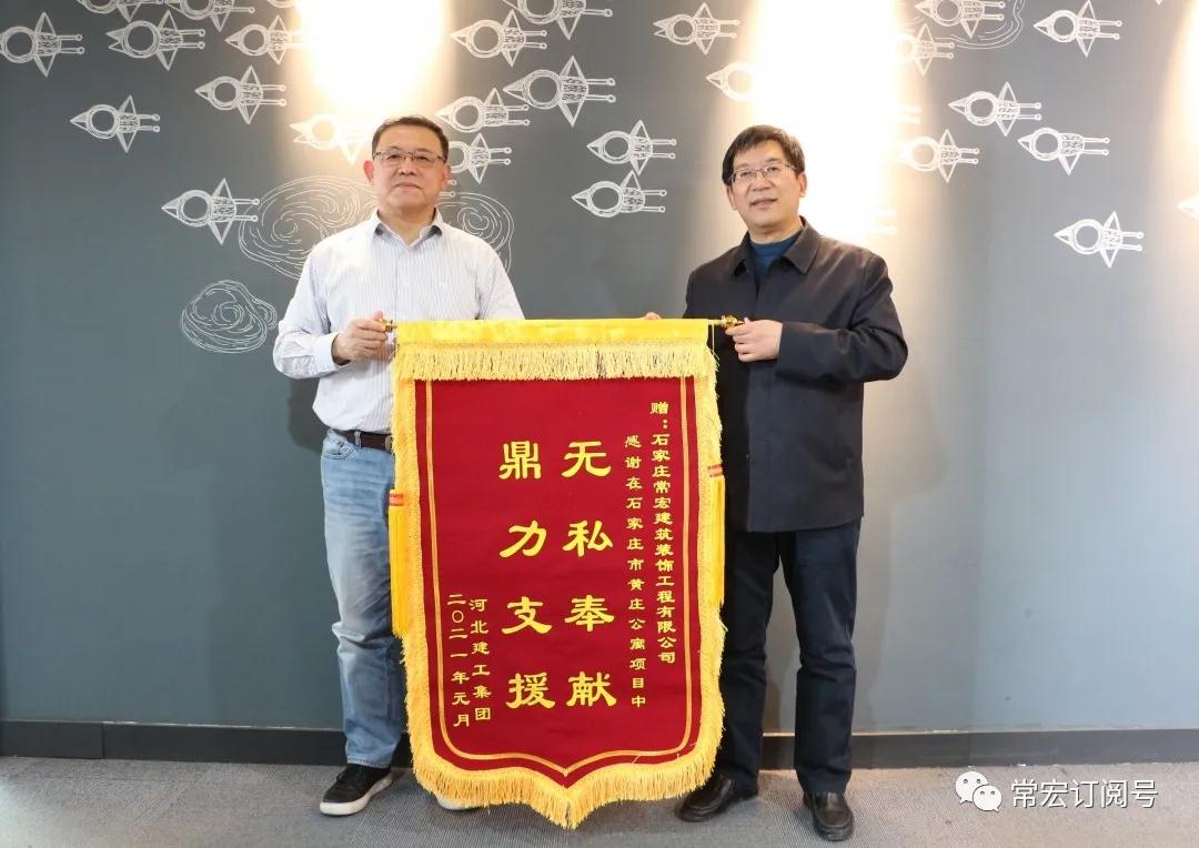河北建工集團(tuán)董事長(zhǎng)李云霄(右)向常宏董事總經(jīng)理王躍(左)贈(zèng)予錦旗