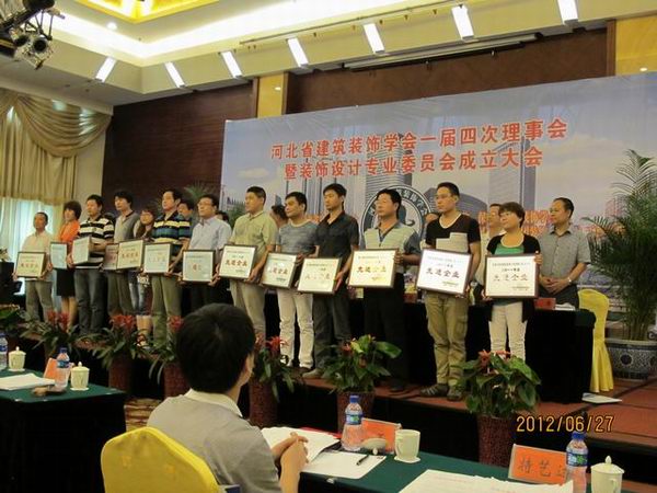 2012年6月27日河北省建筑裝飾學(xué)會(huì)組織召開第一屆第四次理事會(huì)暨裝飾設(shè)計(jì)專業(yè)委員會(huì)成立大會(huì),會(huì)上對榮獲2011年河北省建筑裝飾行業(yè)先進(jìn)企業(yè)、優(yōu)秀企業(yè)家進(jìn)行了表彰,常宏裝飾也又一次被評為2011年河北省建筑裝飾行業(yè)先進(jìn)企業(yè),王躍總經(jīng)理被評為優(yōu)秀企業(yè)家。省學(xué)會(huì)會(huì)長、秘書長及各副會(huì)長單位領(lǐng)導(dǎo)為獲獎(jiǎng)單位進(jìn)行了頒獎(jiǎng)。